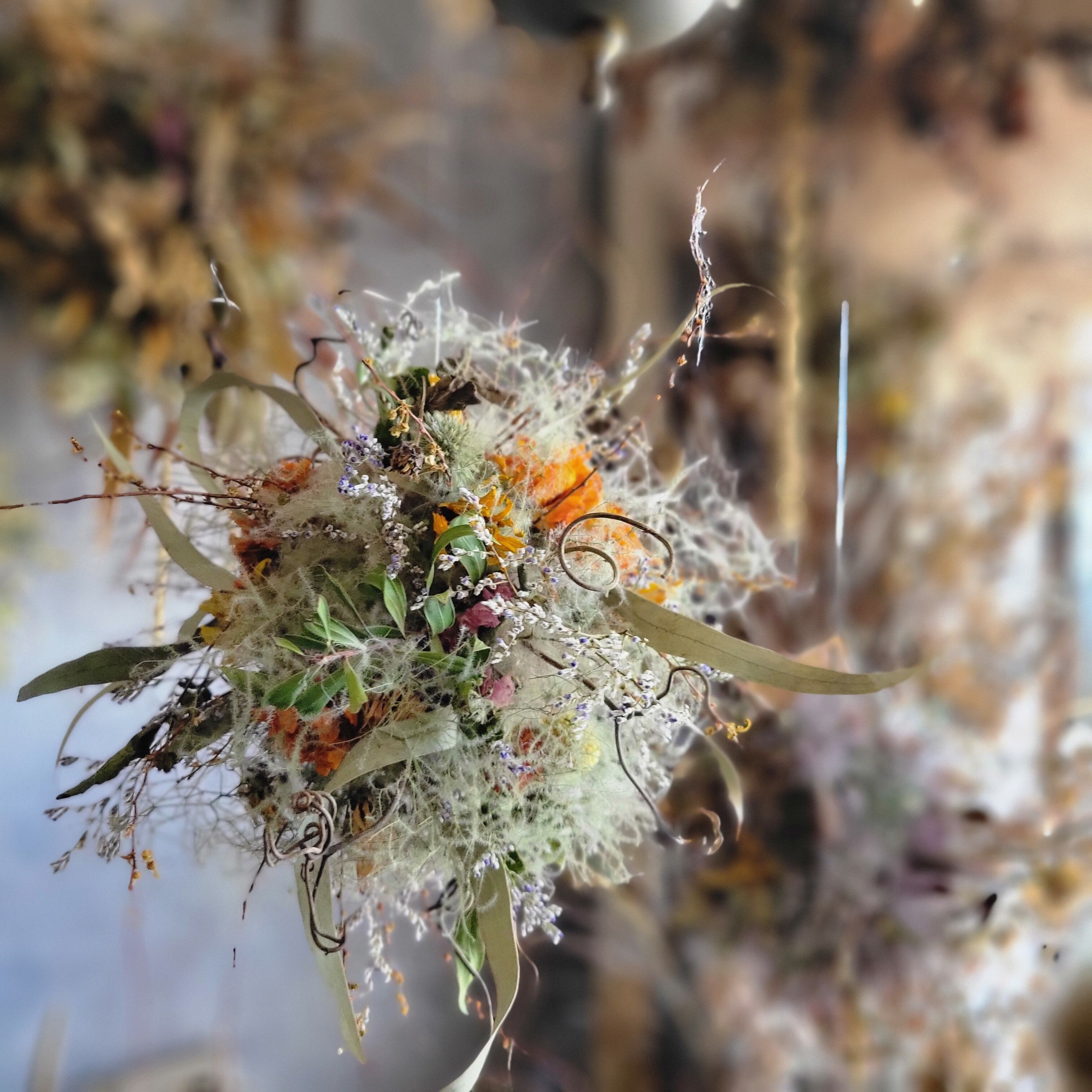 元気が出るビタミンカラーのオレンジや黄色のお花に、少しくすんだブルーのルリタマアザミ、ユーカリ、スモークツリーを組み合わせた魅力的なドライフラワーボールです。長さMAX24cmの存在感あるハンギングボールは、どの空間にも華やかさとトレンドをプラスします!