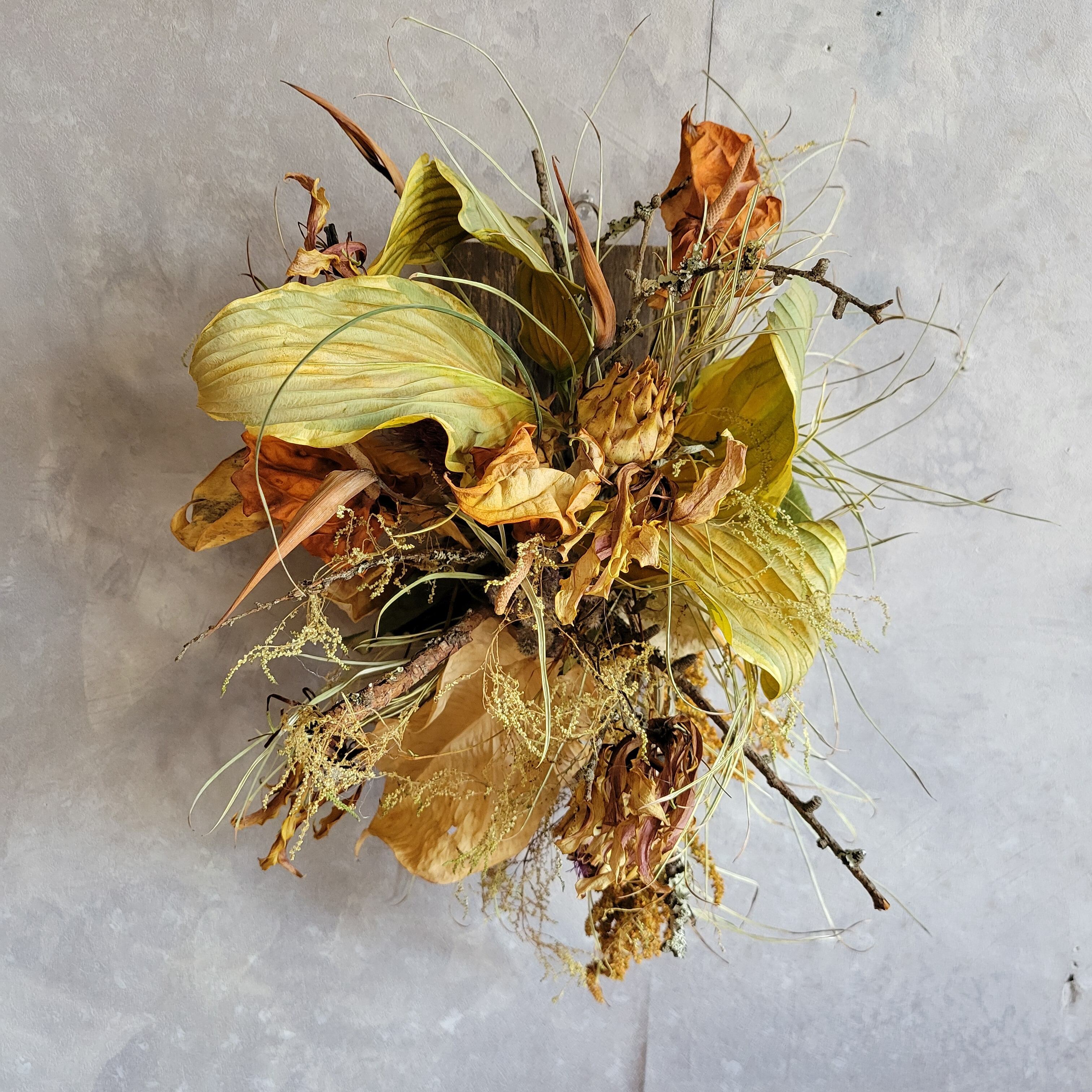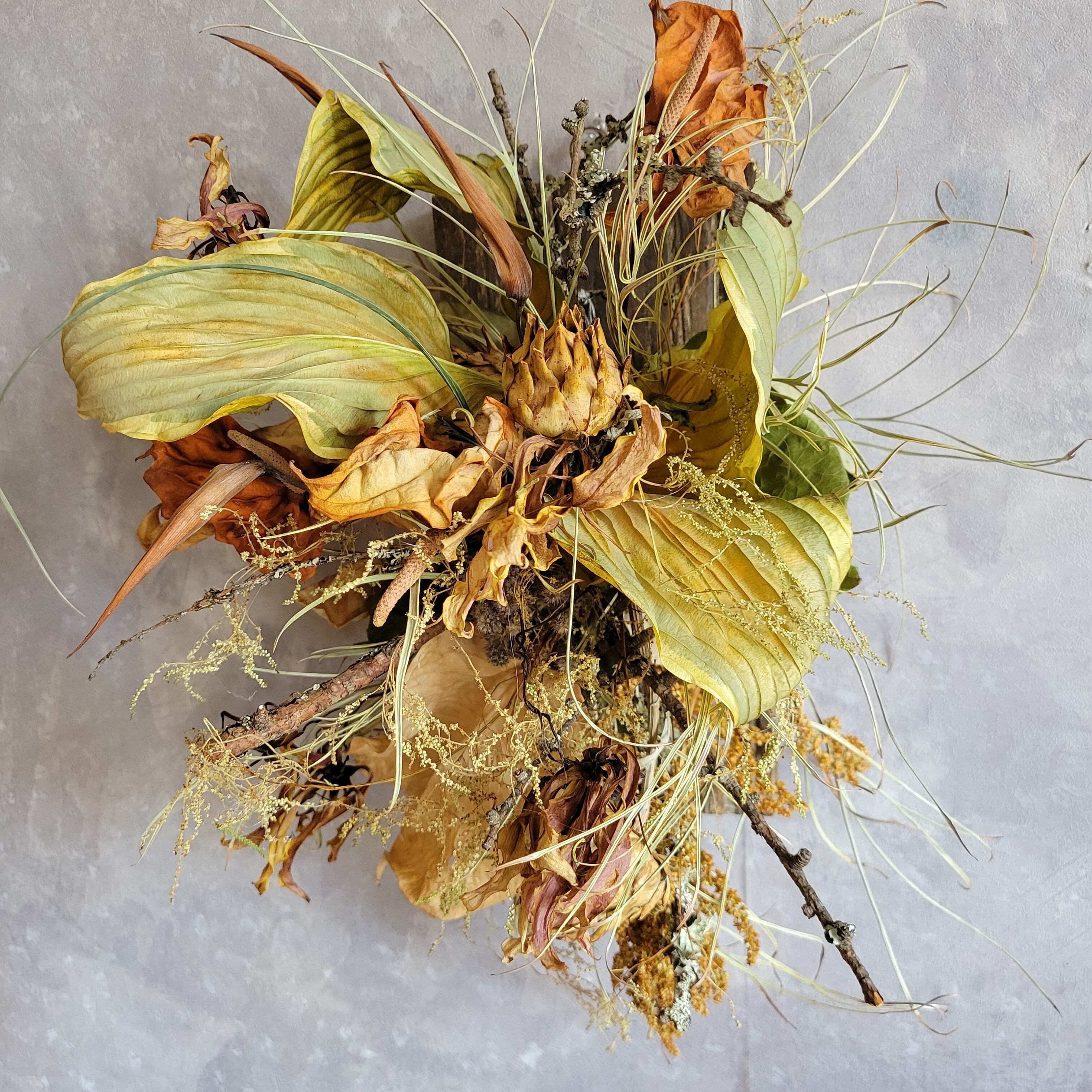 自然の美しさを活かした古木プレートアレンジメントは、サイズ38cm×25cmの縦型デザインで、豊かな動きを生み出すギボウシやアマランサスを使っています。さらに、アンスリウムやヘリコニア、アーティチョークがカッコ良さを引き立て、シックでありながらもナチュラルな雰囲気を演出します!