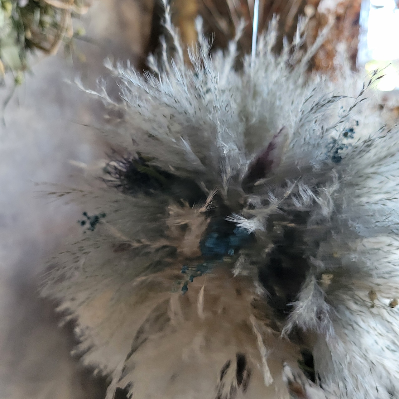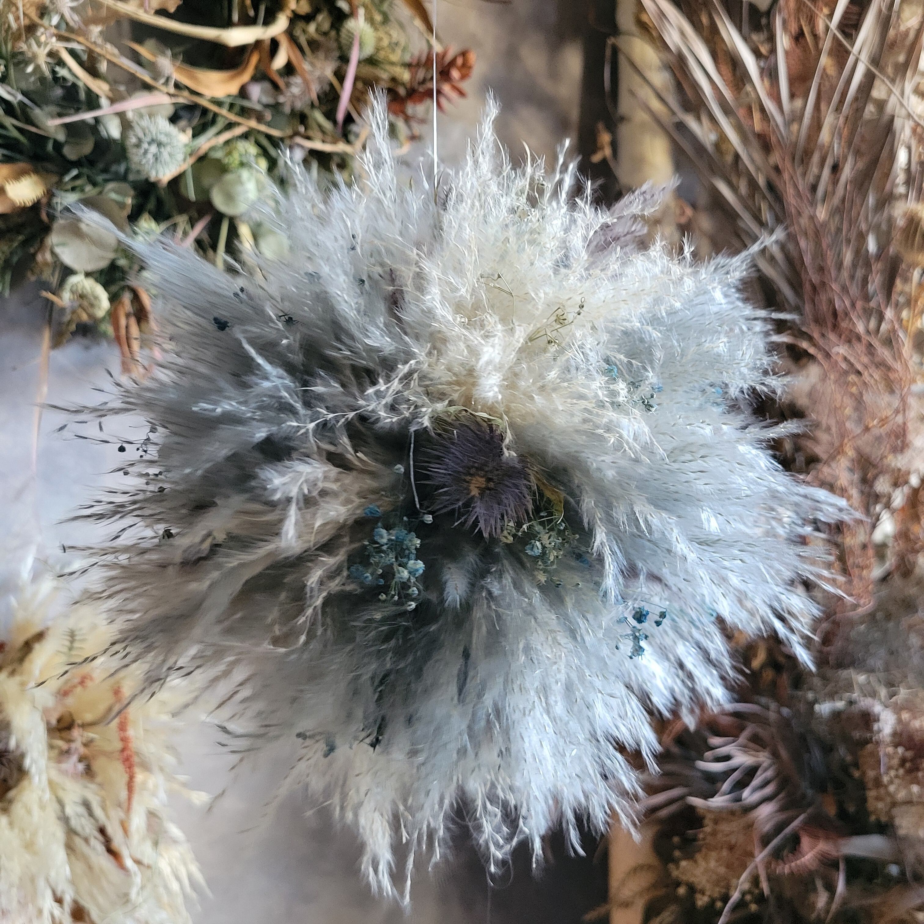 グレーのパンパスグラスをメインとしたハンギングボールに白のパンパスグラスとブルーのドライフラワーをミックスしました。