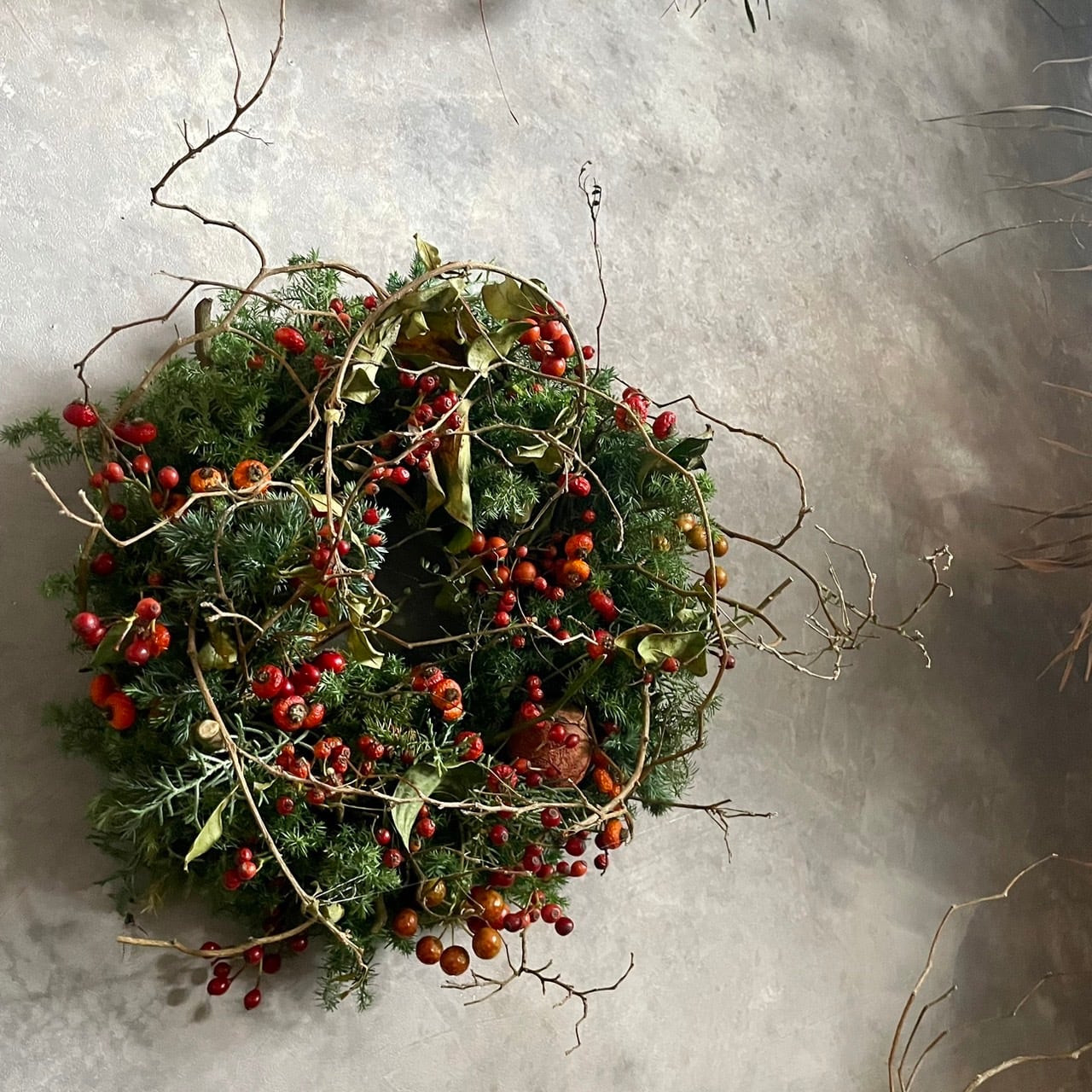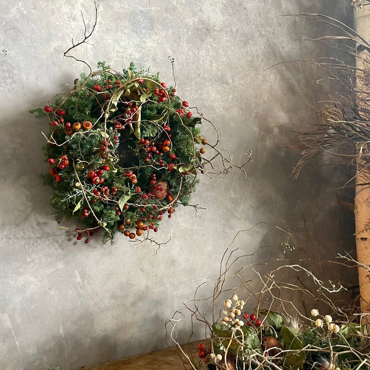 シンプルでナチュラルな雰囲気を持つクリスマス赤い実リースが新登場です!こちらはS、M、Lの3サイズ展開で、写真はMサイズです。グリーンの針葉樹をベースに、野ばらやバラの実、サンキライ、ザクロの素材が絶妙に組み合わされ、リトルベイビーの枝によって立体的に仕上げられています。