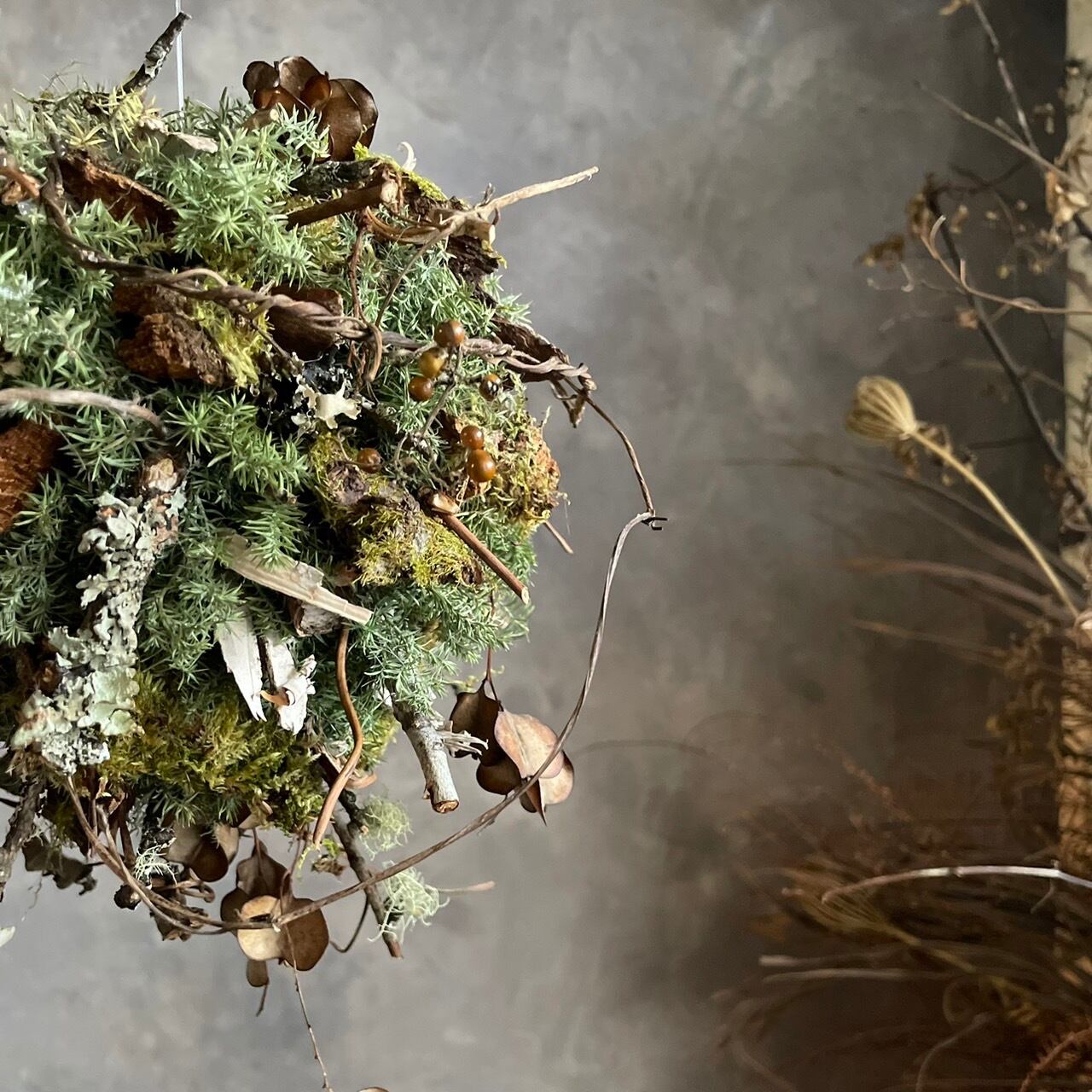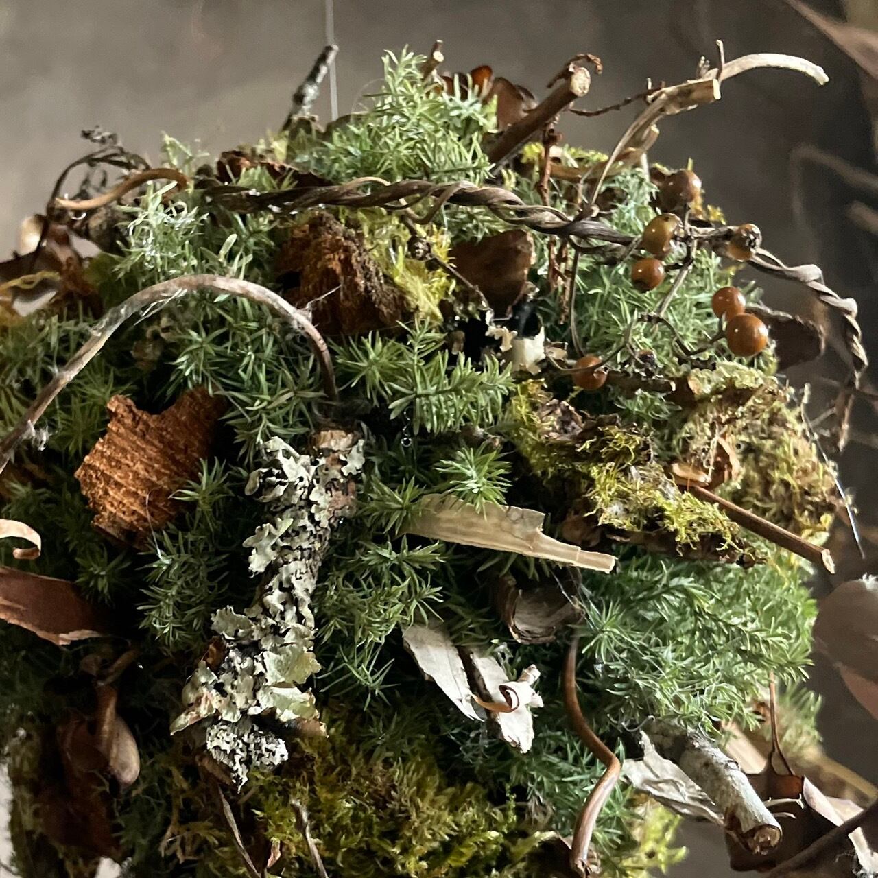 自然の美しさを大切にした、素朴な大人クリスマスを演出するハンギングボールが新登場です!直径16cmのこのクリスマスボールは、グリーンの針葉樹を基に、苔付き小枝やヤマイモのツル、ヘクソカズラなど、多様なナチュラル素材をふんだんに使用しています。その結果、温もり溢れるデザインが特徴です。