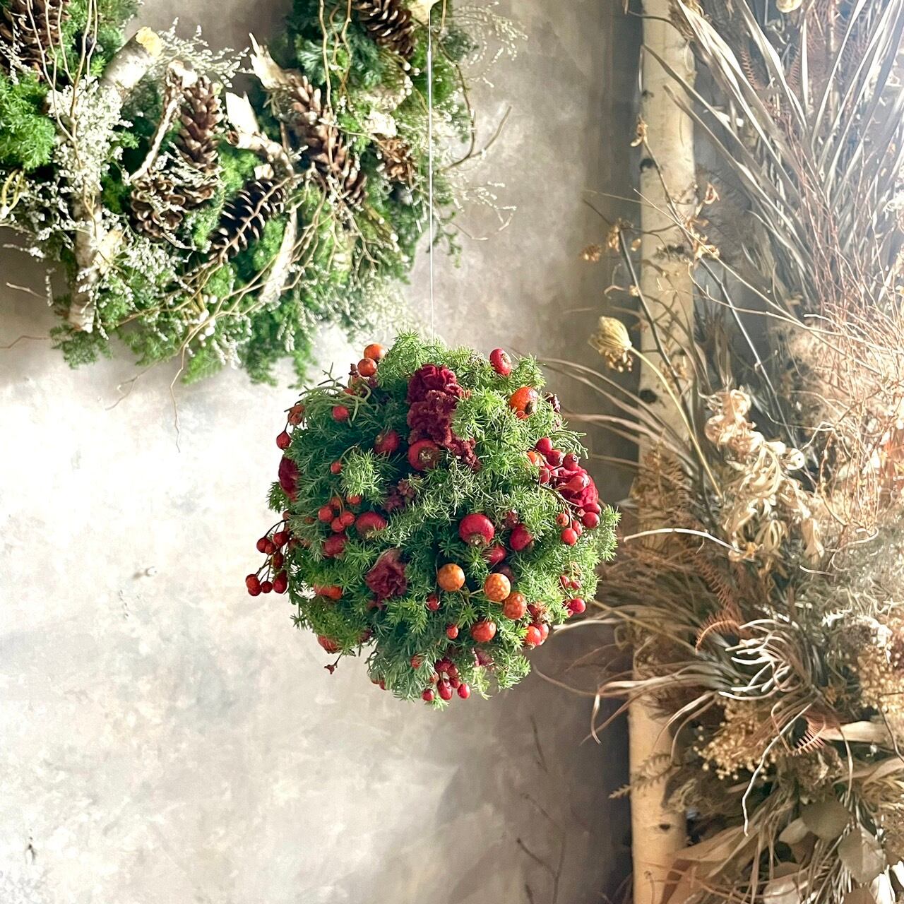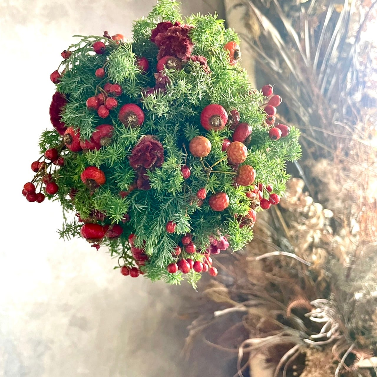 華やかで温かみあるクリスマスシーズンを演出する、特別なハンギングボールが登場しました!直径16cmのこのクリスマスボールは、赤い実野ばらの実、バラの実、サンキライの実、シンフォリカルポスの実といった豊かな素材をふんだんに使い、ベルベットのような質感の赤いケイトウがアクセントとなっています。赤×緑のクリスマス定番カラーで、見る人を魅了するデザインが特徴です。