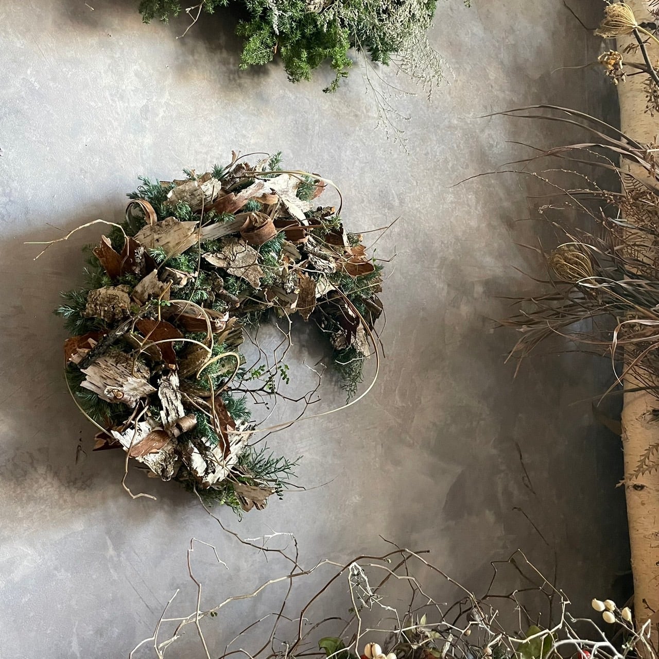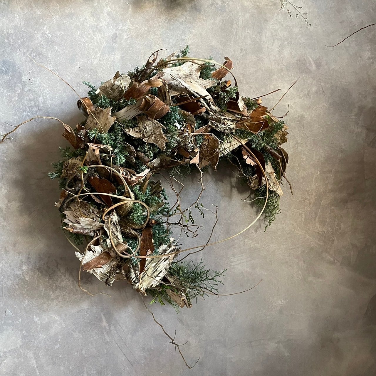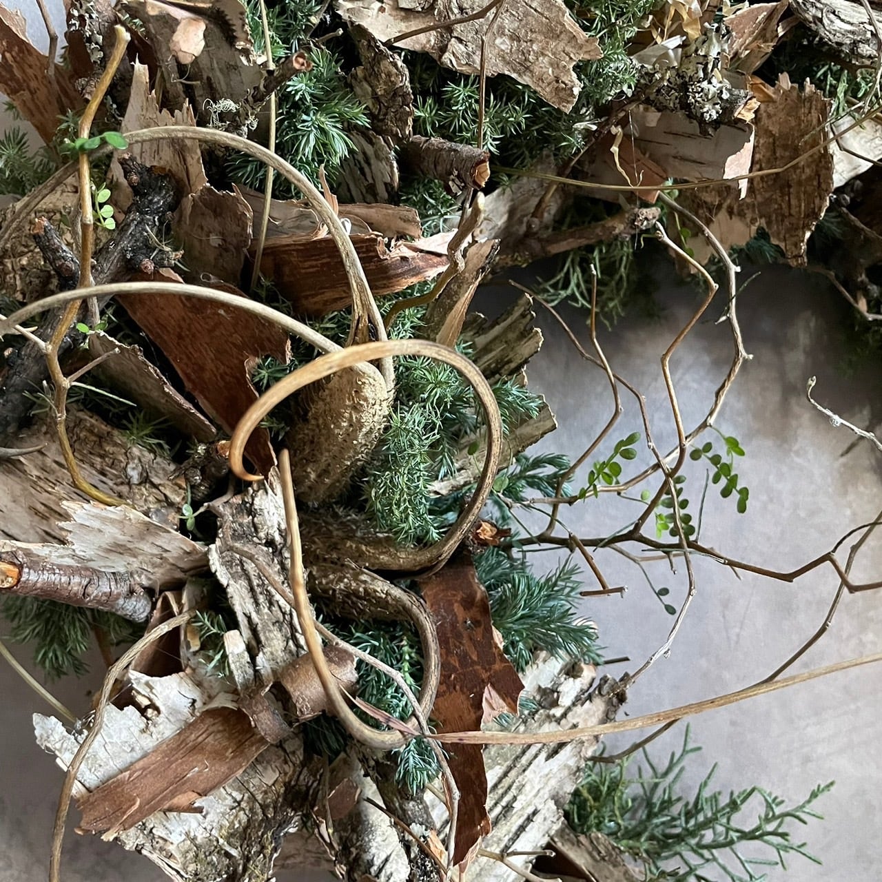 シックで洗練された大人のクリスマスを演出する、白樺とツノゴマを組み合わせた三日月リースが登場です!サイズ32cmのこのリースは、自然素材の白樺の樹皮と個性的なツノゴマを使用し、シンプルながらも奥深い魅力を持っています。