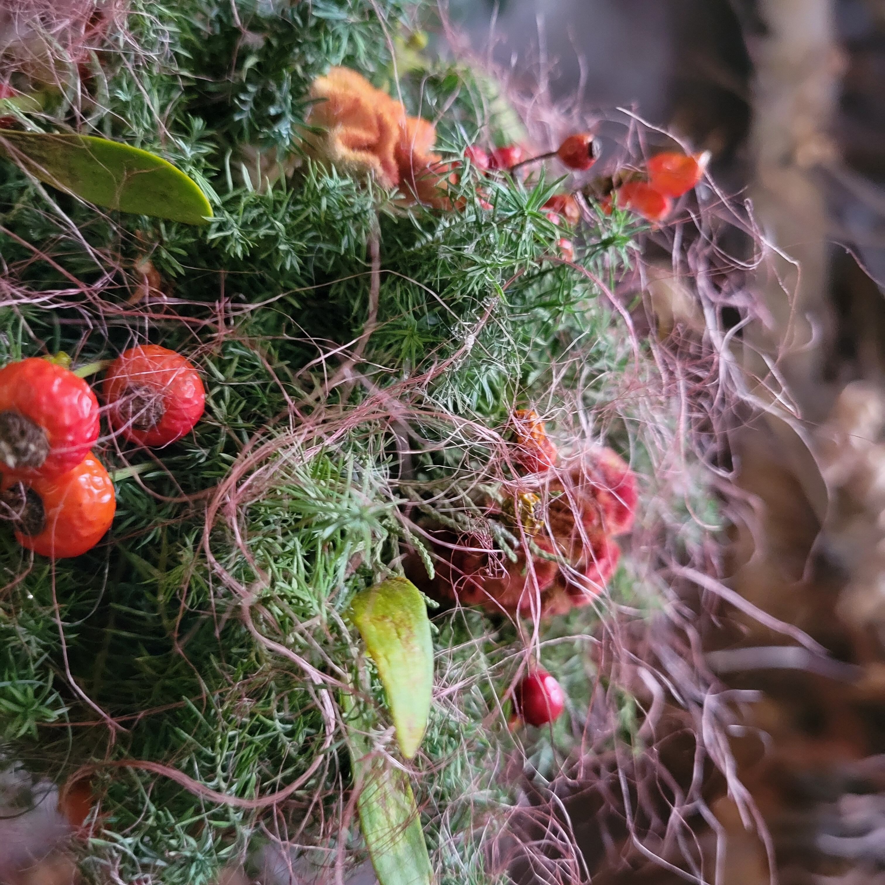 冬の訪れを感じさせる、赤い実とケイトウを使ったクリスマスボールが登場です!直径16cmのこのボールには、野ばら、サンキライ、バラの実、さらにヤドリギの葉を組み合わせてデザインされており、目を引く華やかな雰囲気を演出しています。ゆらゆらと揺れる姿は、見る人の心を癒してくれることでしょう。